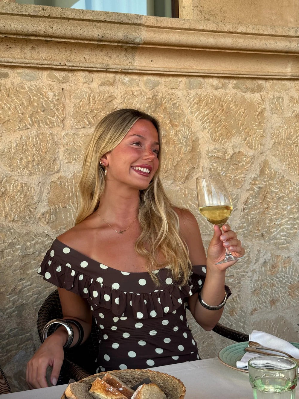The Luna Polka Dot Maxi Dress brings timeless charm with its flowing silhouette and classic pattern. Designed to flatter with gathered shoulders and a waist-defining tie, it moves effortlessly from day to evening. The elegant open back adds a modern twist to this refined staple.